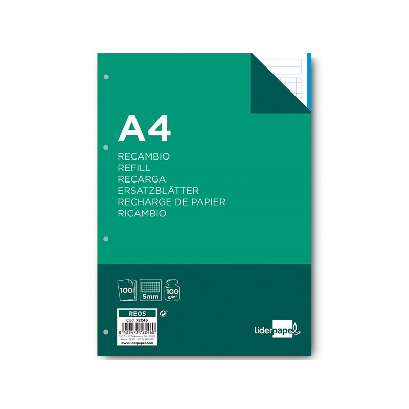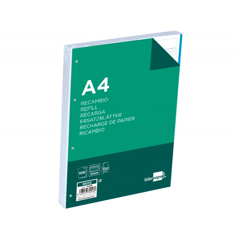 Recarga liderpapel din a4 100 f 100 gr quadricula5 mm sem margen 4 furos bandas de 5 cores