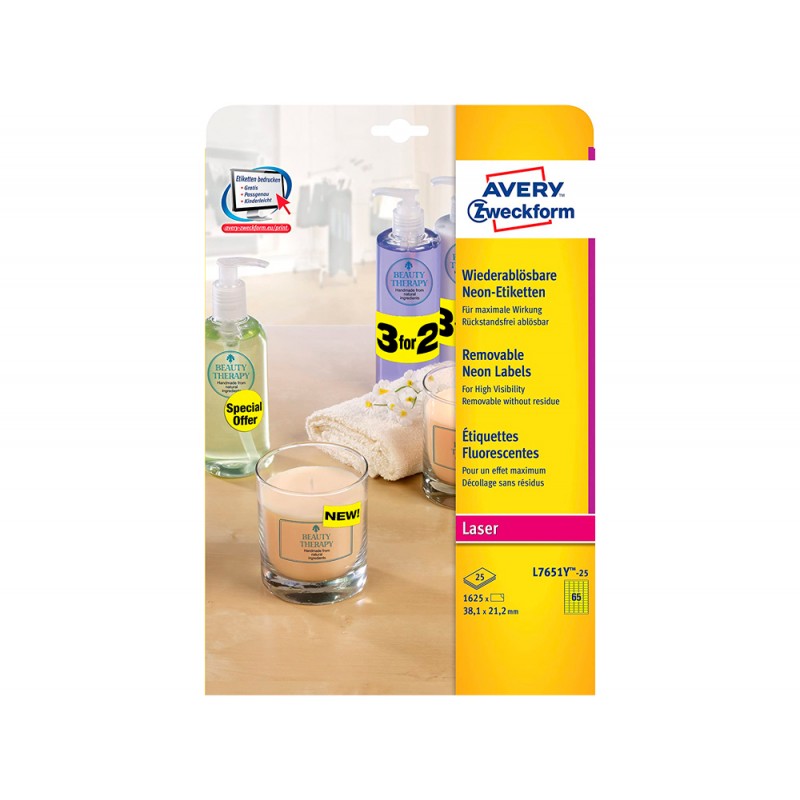 Etiqueta adesiva avery tamanho 38,1x21,2 mm removivel amarela fluorescente caixa de 1625 unidades