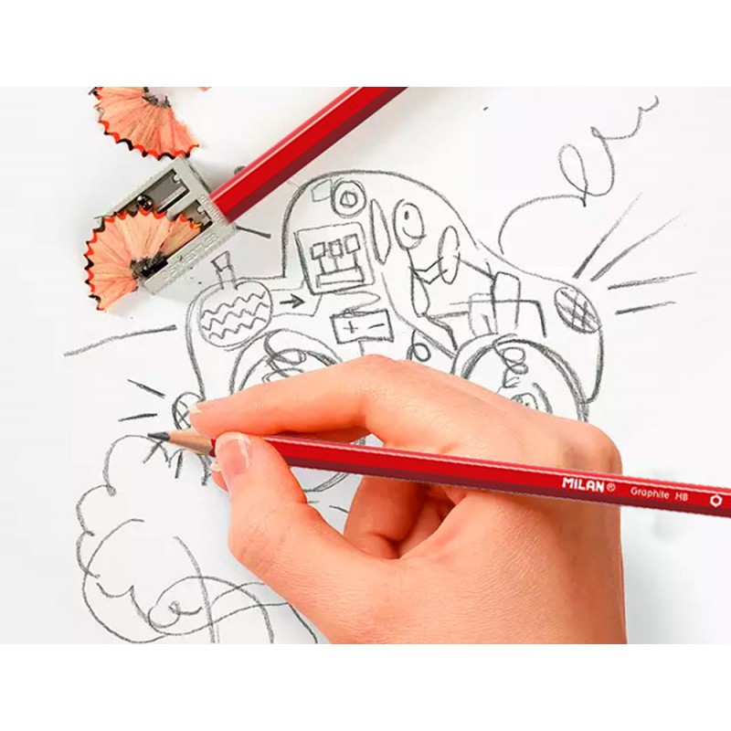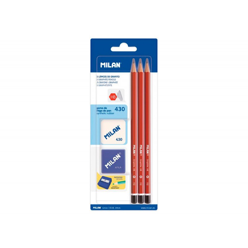 Lapis de grafite milan hexagonal hb + borracha 430 + apara lapis blister de 3 unidades