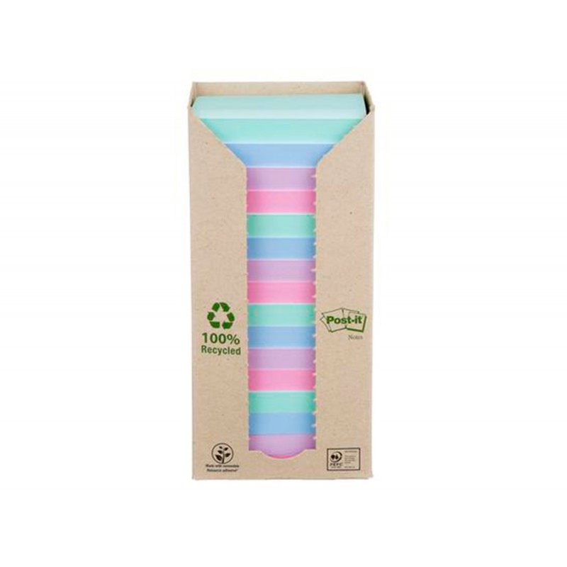 Bloco de notas adesivas post-it 76x76 mm 100% reciclado pefc em torre pack de 16 unidades cores sortidas